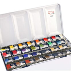 Cele mai multe seturi de acuarelă vin cu vase pre-umplute cu vopsea într-o varietate de culori.
