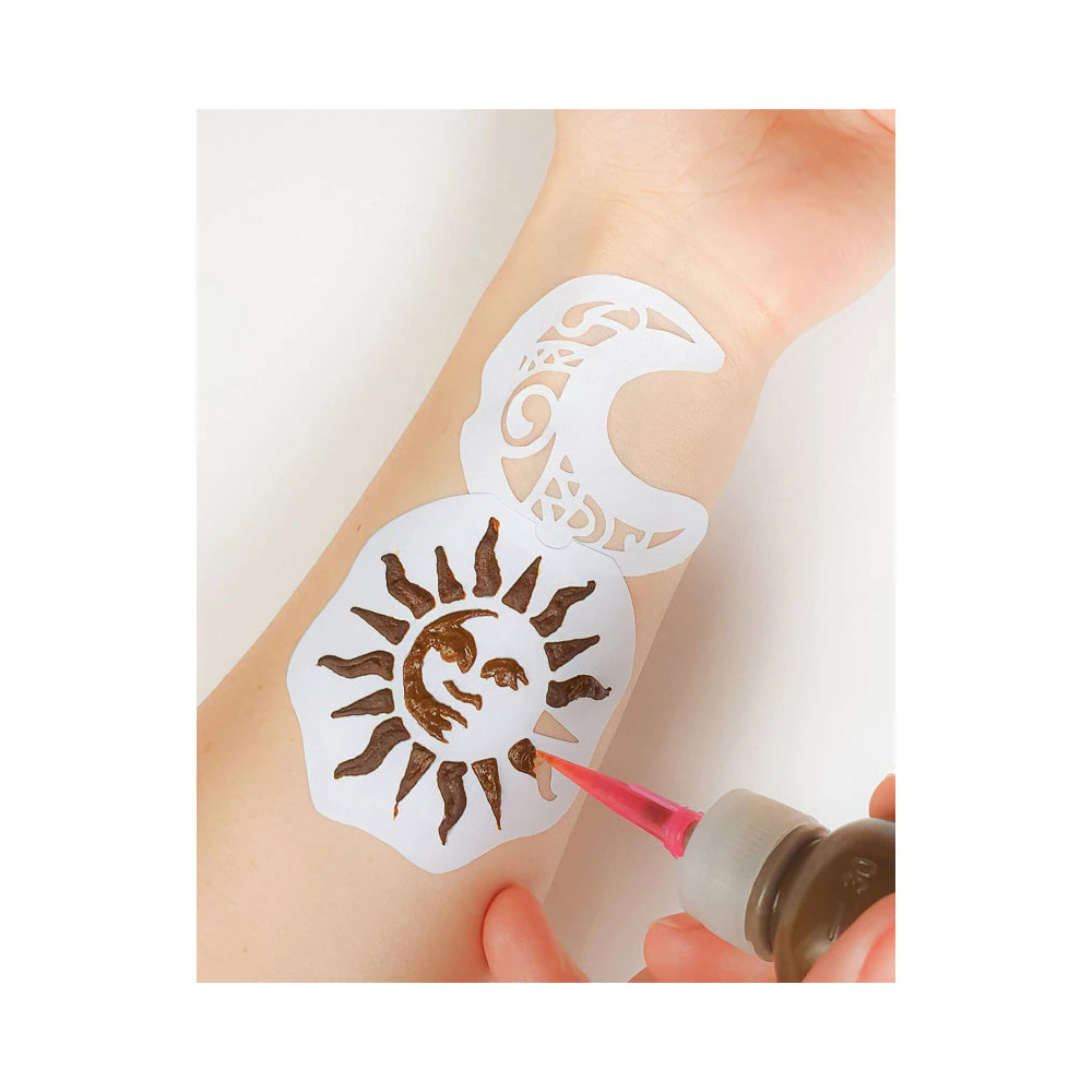 Pasta de henna este foarte simplu de preparat; adăugați apă până la semnul indicat pe recipient și amestecați cu ajutorul spatulei din lemn inclusă în pachet. Pasta trebuie lăsată să se oxideze timp de 1-3 ore înainte de utilizare. Poate fi folosită fie pentru a crea desene personalizate, fie cu ajutorul sabloanelor incluse.