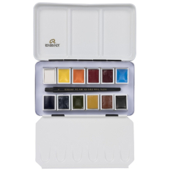 Cutia metalica are 2 panouri ce se folosesc ca palete de pictura. Setul include 12 acuarele in godete, urmatoarele culori: Opaque White (106), Yellow Ochre (227), Azo Yellow Light Cadmium Free (246), Azomethine Green Yellow (296), Benzimidazolone Orange (297), Vermillion (311), Burnt Sienna (411), Ultramarine Deep (506), Cerulean Blue Phthalo (535), Permanent Red Violet (567), Phthalo Green (675), Ivory Black (701).