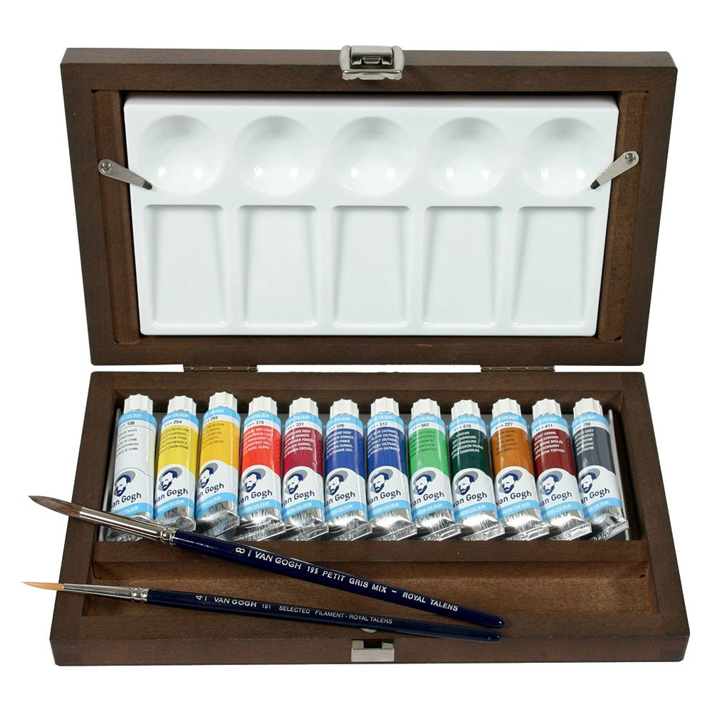 Setul de acuarele Van Gogh Box contine 12 culori in tuburi de 10 ml, doua pensule de buna calitate si o paleta pentru pictura intr-o cutie din lemn cu aspect exclusivist.