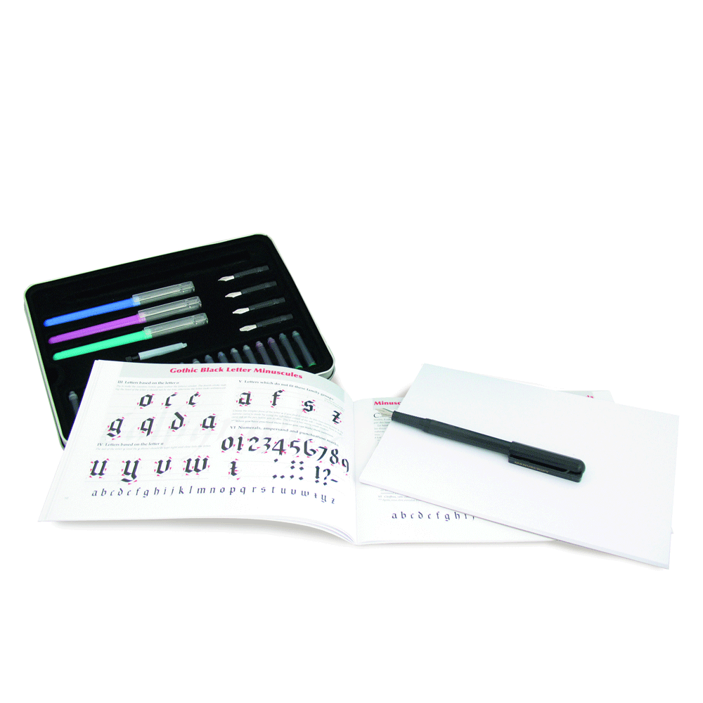 Set ce contine o gama completa de instrumente si materiale pentru caligrafie astfel, setul contine 5 penite, 4 stilouri pentru caligrafie si 18 rezerve cu cerneala impreuna cu un pliant cu instructiuni. Acest set este ideal pentru incepatorii ce doresc sa invete o varietate mare de stiluri caligrafice.
