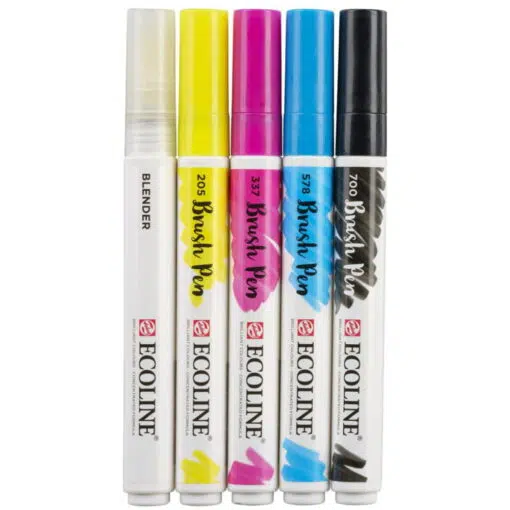 Acest set conține 5 carioci tip pensula Ecoline Brush în culorile primare plus un marker negru si un blender pentru combinarea culorilor. Markerul Ecoline Brush Pen se caracterizează prin vârful său flexibil asemanator unei pensule și prin gama extinsă de culori intense si datorită formulei sale pure, pe bază de colorant. Culorile transparente oferă cele mai bune rezultate atunci când sunt folosite pe hârtie albă sau foarte deschisă. Dacă doriți, puteți reduce cu ușurință intensitatea culorii prin diluarea cu apă sau folosind blenderul Brush Pen. Aceste carioci sunt perfecte pentru caligrafie, desene în acuarelă, schițe rapide și finisaje.