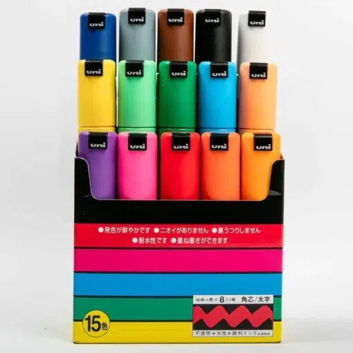 Setul de Carioci Posca Marker PC-8K – Color Set 15 este un instrument ideal pentru artisti, designeri si oricine doreste sa adauge un strop de culoare vibrantă proiectelor sale. Aceste carioci, pe baza de apa, se disting prin culorile lor vibrante, similare cu culorile poster, oferind o rezistenta remarcabila la apa.
