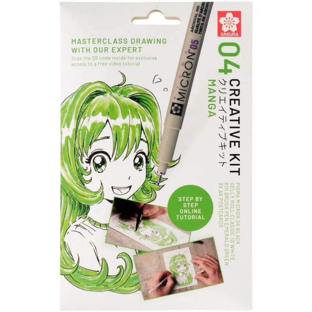 Sakura Creative Art Kit – Manga este un set complet care iti permite sa creezi propria ta ilustratie de la zero pana la final. Acest kit include toate instrumentele necesare pentru a realiza o ilustratie manga expresiva, urmand tutorialul video gratuit inclus. Pachetul contine un fineliner Pigma Micron 05 negru, un Gelly Roll Basic 10 alb, un Koi Coloring Brush Pen in nuanta Emerald Green si trei foi de hartie Koi Mixed Media in format A6.