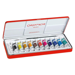 Set Caran d’Ache cu guase de calitate profesionala Studio Gouache intr-o cutie din metal cu design atractiv. Acest set contine 12culori guase in tuburi de 10 ml si o pensula.