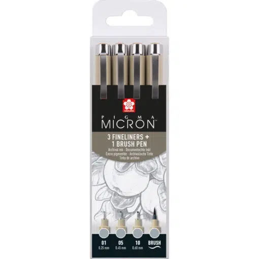Selecție de 4 linere Pigma Micron și Brush Light Cool Grey: Pigma Micron 01 (0,25 mm), Pigma Micron 05 (0,45 mm), Pigma Micron 10 (0,60 mm) și Pigma Brush. Cu aceste griuri graduale, puteți adăuga umbrire, profunzime, accente vizuale și efecte de stratificare ilustrațiilor, desenelor, jurnalelor bullet și multe altele.