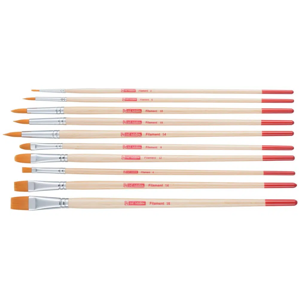 Set cu 10pensule late sintetice cu par din poliester si maner lung ce pot fi folosite la pictura in culori de ulei, acrilice, tempera sau guase.