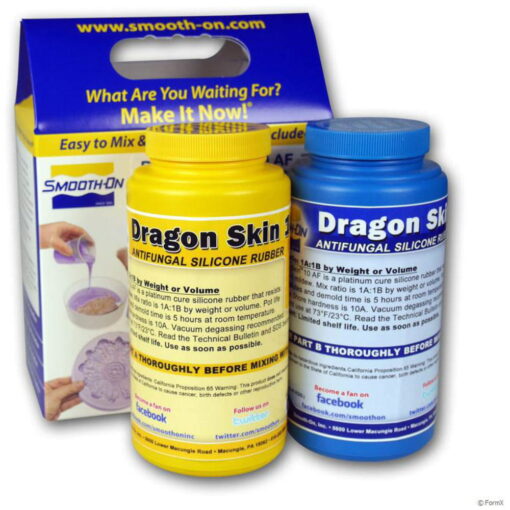 Material versatil cu efecte speciale testat în timp – Moale, super-puternic și elastic, Dragon Skin™ este folosit în întreaga lume pentru a produce efecte spectaculoase pentru piele și creaturi. Un număr infinit de efecte de culoare pot fi obținute prin adăugarea de pigmenți siliconici Silc Pig™ sau pudre de efecte Cast Magic™. Cauciucul întărit poate fi vopsit și cu sistemul Psycho Paint™. Materialul întărit este sigur pentru piele și certificat de un laborator independent.